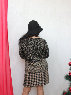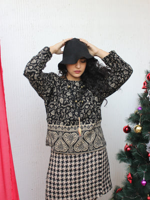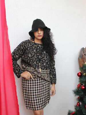 Elevate your winter wardrobe with the Kaali Patra Top, a black woollen beauty designed in shawl fabric with refined leaf patterns. Perfectly balancing traditional charm with modern sophistication, this top pairs seamlessly with trousers or skirts for an effortlessly chic ensemble. See the last image for size chart.